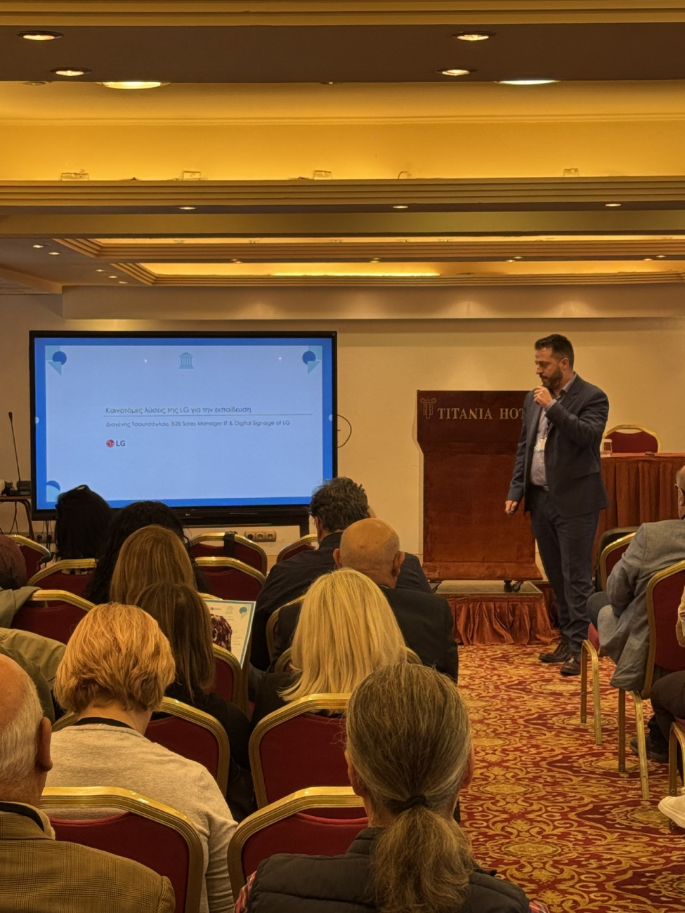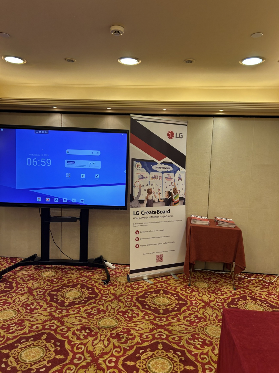 - Η διαδραστική οθόνη LG CreateBoard, που ενισχύει τη διδασκαλία και τη συμμετοχή στην τάξη, όπως ανέφερε ο Διογένης Τσουτσόγλου, B2B Sales Manager IT & Digital Signage της LG Electronics Hellas.