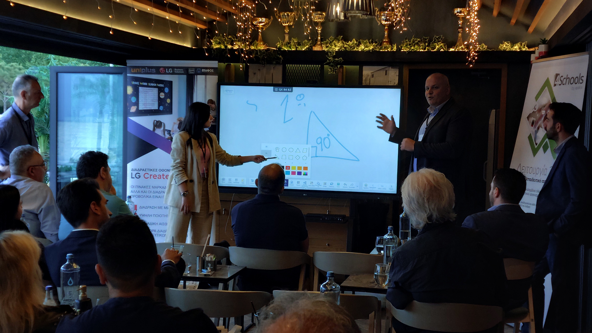 Η εκδήλωση ξεκίνησε με μια σύντομη παρουσίαση από τους εκπρόσωπους της LG, της Uniplus και του ΕΠΑΦΟΥ, παρέχοντας στους παρευρισκομένους μια εισαγωγή για τη δραστηριότητα τους, τα προϊόντα και τις υπηρεσίες που προσφέρουν. Στη συνέχεια, ακολούθησε μια εξειδικευμένη παρουσίαση της διαδραστικής οθόνης, όπου συνεργάτες από το εμπορικό και το τεχνικό τμήμα των εταιρειών παρουσίασαν τις δυνατότητες και τα πλεονεκτήματα της διαδραστικής οθόνης μέσα από πρακτικά παραδείγματα χρήσης στις αίθουσες διδασκαλίας.