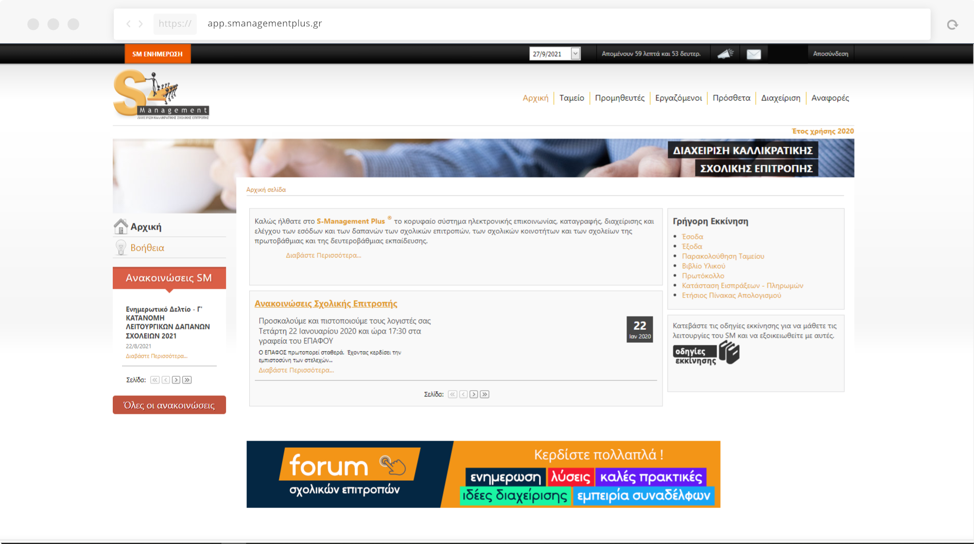 Το SManagement είναι η ολοκληρωμένη πύλη διαχείρισης και πληροφόρησης των Σχολικών Επιτροπών και των Σχολικών Κοινοτήτων. ...Περισσότερα